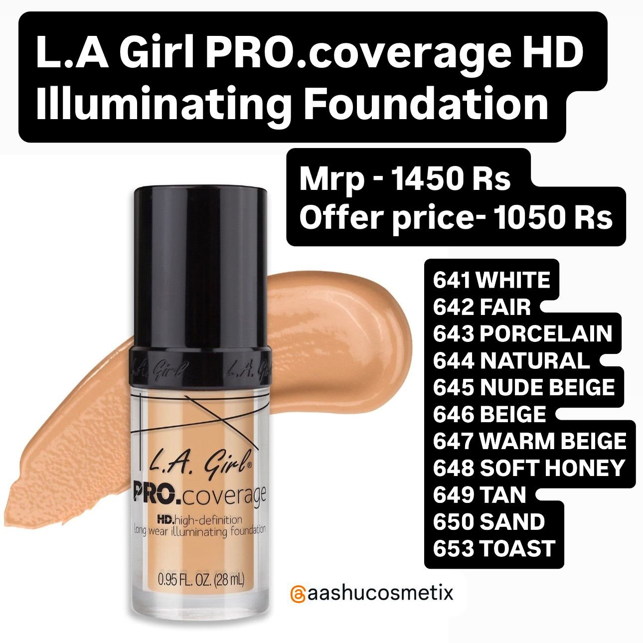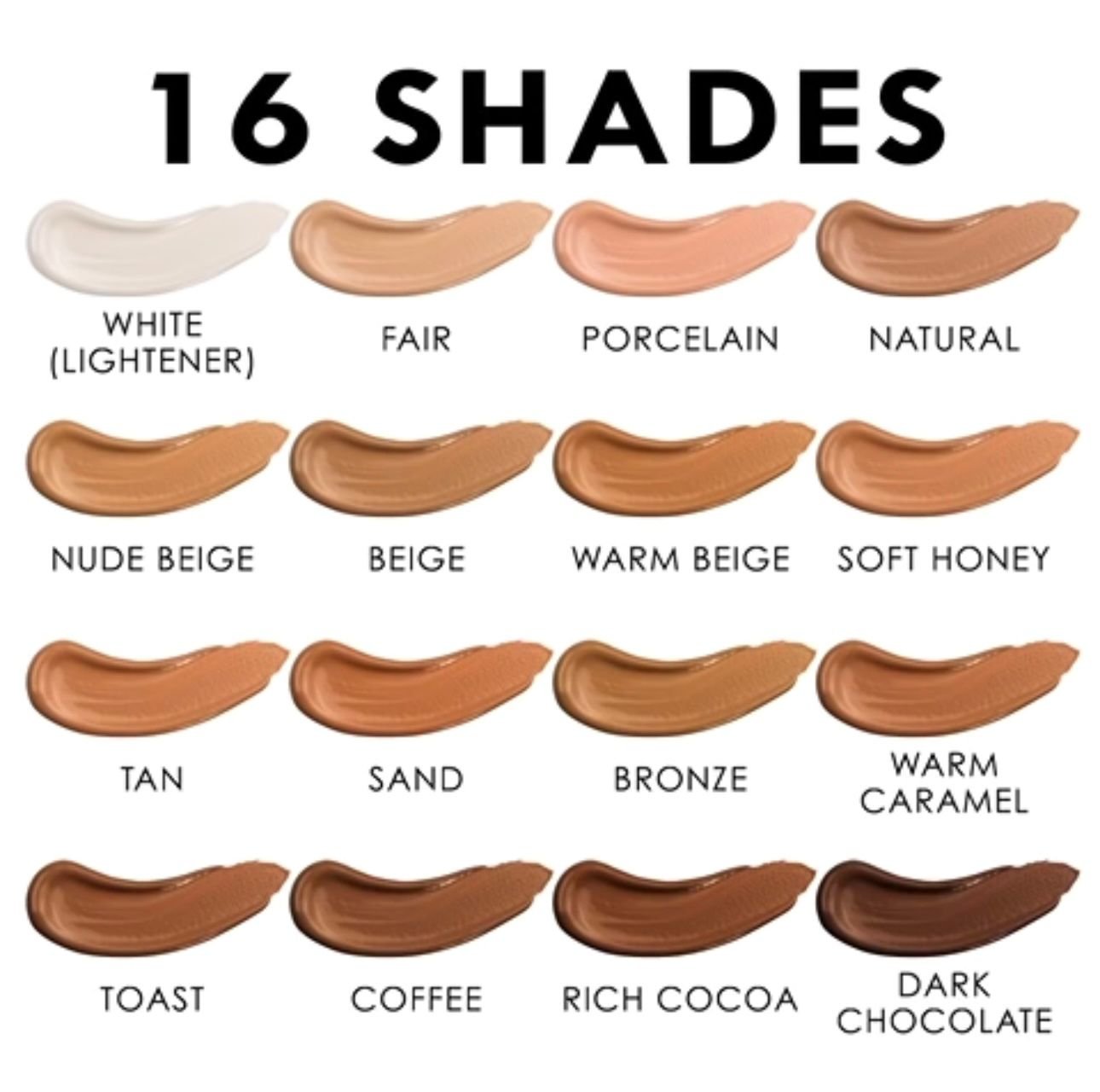 641 White – lightener, 642 Fair, 643 Porcelain, 644 Natural, 645 Nude Beige, 646 Beige, 647 Warm Beige, 648 Soft honey, 649 Tan, 650 Sand, 653 Toast